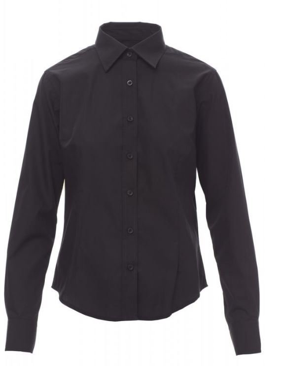 Chemise femme, fil de coton peigné très fin, coupe cintrée, pinces de reprise devant et derrière, col italien, poignets profilés avec deux boutons et une boutonnière, patte de boutonnage visible et boutons teinte assortie. Empiècement droit dans le dos. Tissu traité Easy Care.
