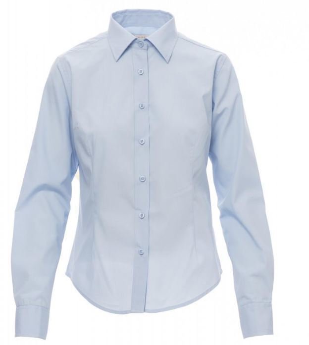 Chemise femme, fil de coton peigné très fin, coupe cintrée, pinces de reprise devant et derrière, col italien, poignets profilés avec deux boutons et une boutonnière, patte de boutonnage visible et boutons teinte assortie. Empiècement droit dans le dos. Tissu traité Easy Care.