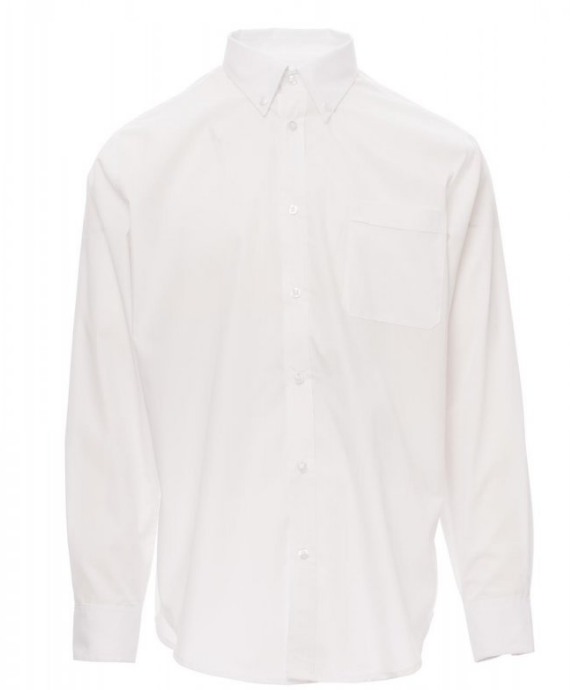 Chemise homme, fil peigné très fin, coupe légèrement cintrée, col boutonné type anglais, poignets arrondis avec deux boutons et une boutonnière, patte de boutonnage visible et boutons nacrés, une poche côté cœur. Empiècement droit dans le dos.