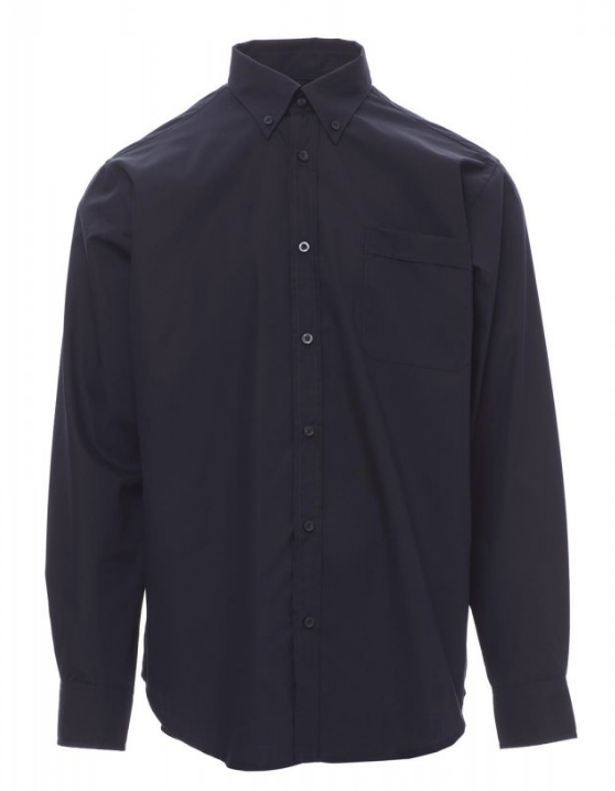 Chemise homme, fil peigné très fin, coupe légèrement cintrée, col boutonné type anglais, poignets arrondis avec deux boutons et une boutonnière, patte de boutonnage visible et boutons nacrés, une poche côté cœur. Empiècement droit dans le dos.