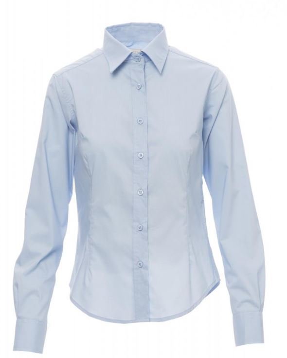 Chemise femme, fil de coton peigné très fin, coupe cintrée, pinces de reprise devant et derrière, col italien, poignets profilés avec deux boutons et une boutonnière, patte de boutonnage visible et boutons teinte assortie. Empiècement droit dans le dos. Tissu traité Easy Care.