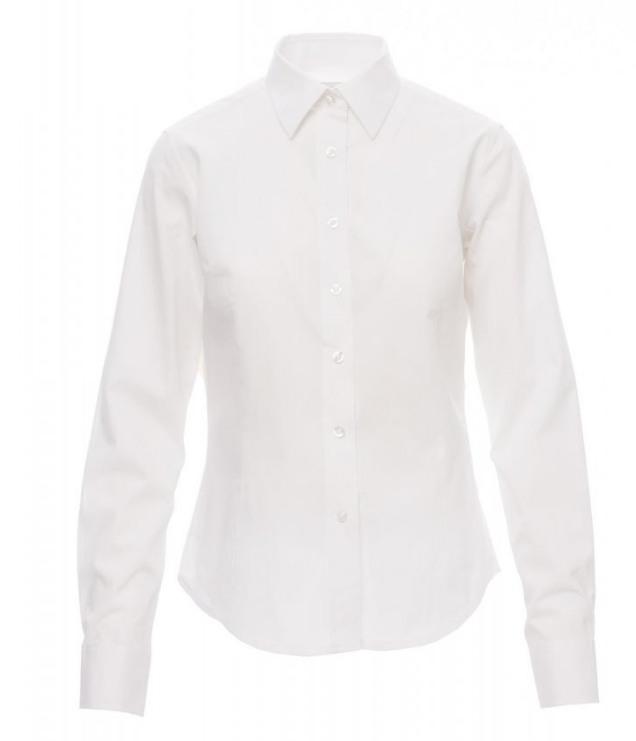 Chemise femme, fil de coton peigné très fin, coupe cintrée, pinces de reprise devant et derrière, col italien, poignets profilés avec deux boutons et une boutonnière, patte de boutonnage visible et boutons teinte assortie . Empiècement dans le dos. Tissu traité Easy Care.