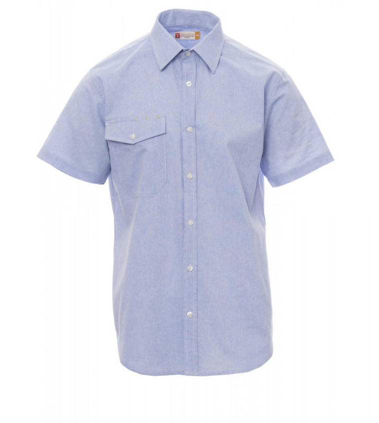 Chemise homme, à manches courtes, à coupe légèrement cintrée, col italien, devant avec patte de boutonnage visible et bouton blanc effet nacré . Poignet profilé à deux boutons et une boutonnière . Dos avec empiècement et pinces de reprise . Une poche technique sur la poitrine fermée par rabat avec bouton et deux porte-stylo.