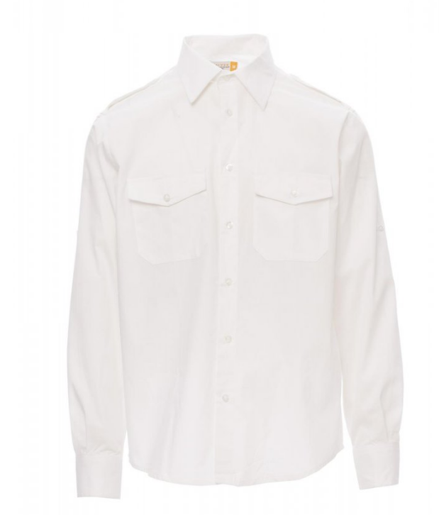 Chemise homme, fil de coton peigné très fin, coupe légèrement cintrée, empiècement droit devant, fermeture par boutons assortis avec boutonnières contrastées, épaulettes, deux poches sur la poitrine avec rabat et porte-stylo . Patte avec bouton sur le bras pour retrousser facilement les manches. La chemise blanche n'a pas de boutonnières contrastées ni d'empiècement devant. Tissu traité Easy Care.