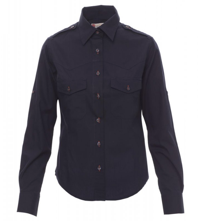 Chemise femme, fil de coton peigné très fin, coupe légèrement cintrée, empiècement droit devant, fermeture par boutons assortis avec boutonnières contrastées, épaulettes, deux poches sur la poitrine avec rabat et porte-stylo . Patte avec bouton sur le bras pour retrousser facilement les manches. La chemise blanche n'a pas de boutonnières contrastées ni d'empiècement devant. Tissu traité Easy Care.