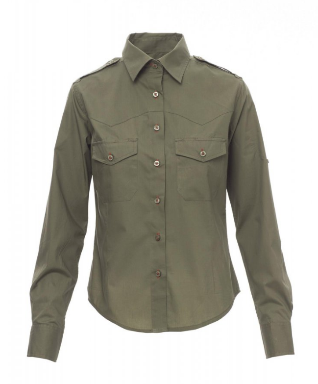 Chemise femme, fil de coton peigné très fin, coupe légèrement cintrée, empiècement droit devant, fermeture par boutons assortis avec boutonnières contrastées, épaulettes, deux poches sur la poitrine avec rabat et porte-stylo . Patte avec bouton sur le bras pour retrousser facilement les manches. La chemise blanche n'a pas de boutonnières contrastées ni d'empiècement devant. Tissu traité Easy Care.
