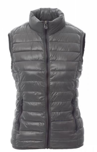 Gilet/doudoune femme, coupe ergonomique, à zip de 8 mm en plastique avec curseur en métal, fin liseré à la taille, deux poches extérieures. Intérieur : rembourrage polyester effet duvet, trois poches.