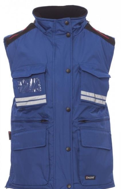 Gilet femme, coupe ergonomique, à zip de 8 mm en plastique avec curseur en métal, avec rabat et boutons en plastique, capuche profilée détachable et/ou repliable dans le col, passepoils réfléchissants gris devant et derrière, fente latérale à soufflet et zip, neuf poches extérieures dont deux LOCK SYSTEM, deux zippées et intérieur renforcé, une avec porte-badge réversible. Intérieur : rembourré, col, dos et chauffe-reins en micropolaire, coulisse à la taille et fermeture éclair intérieure pour faciliter impressions et broderies.