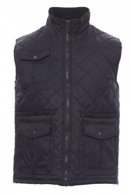 Gilet homme matelassé, zip de 8 mm en plastique avec curseur en métal, fentes latérales avec bouton, cinq poches extérieures, dont deux LOCK SYSTEM. Intérieur : rembourré, col en bord-côte de velours, une poche.