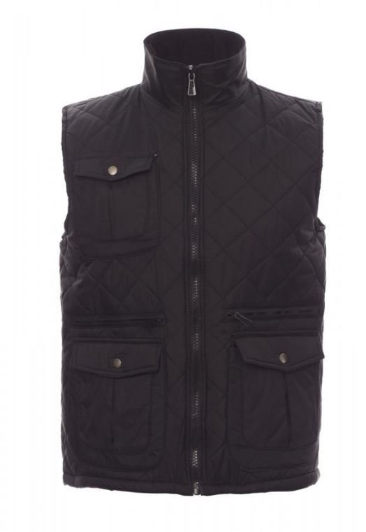 Gilet homme matelassé, zip de 8 mm en plastique avec curseur en métal, fentes latérales avec bouton, cinq poches extérieures, dont deux LOCK SYSTEM. Intérieur : rembourré, col en bord-côte de velours, une poche.