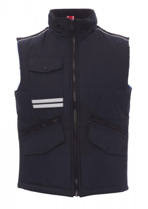 Gilet unisexe, à zip de 8 mm en plastique avec curseur en métal, à rabat et boutons en plastique, arrière profilé, deux poches extérieures LOCK SYSTEM et deux poches à fermeture éclair, poches obliques pour faciliter l'introduction des mains, une poche de poitrine pour smartphone et anneau porte-badge, passepoils réfléchissants sur poche de poitrine et au dos. Intérieur : rembourré, polaire en contraste au dos et sur le col, une poche, fermeture éclair intérieure pour faciliter impressions et broderies.