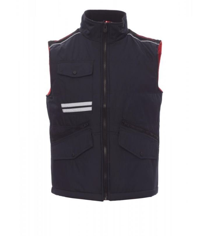 Gilet unisexe, à zip de 8 mm en plastique avec curseur en métal, à rabat et boutons en plastique, arrière profilé, deux poches extérieures LOCK SYSTEM et deux poches à fermeture éclair, poches obliques pour faciliter l'introduction des mains, une poche de poitrine pour smartphone et anneau porte-badge, passepoils réfléchissants sur poche de poitrine et au dos. Intérieur : rembourré, polaire en contraste au dos et sur le col, une poche, fermeture éclair intérieure pour faciliter impressions et broderies.