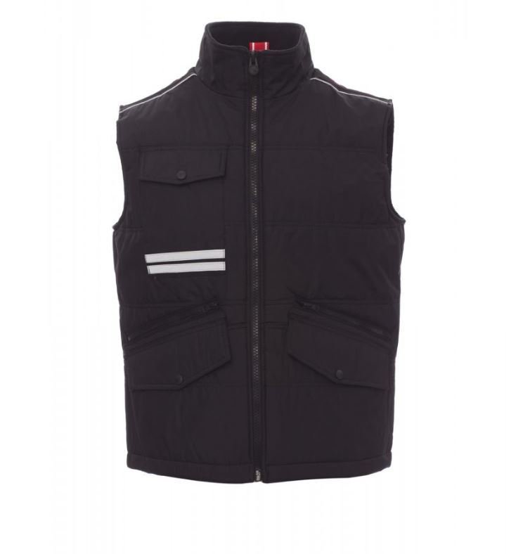 Gilet unisexe, à zip de 8 mm en plastique avec curseur en métal, à rabat et boutons en plastique, arrière profilé, deux poches extérieures LOCK SYSTEM et deux poches à fermeture éclair, poches obliques pour faciliter l'introduction des mains, une poche de poitrine pour smartphone et anneau porte-badge, passepoils réfléchissants sur poche de poitrine et au dos. Intérieur : rembourré, polaire en contraste au dos et sur le col, une poche, fermeture éclair intérieure pour faciliter impressions et broderies.