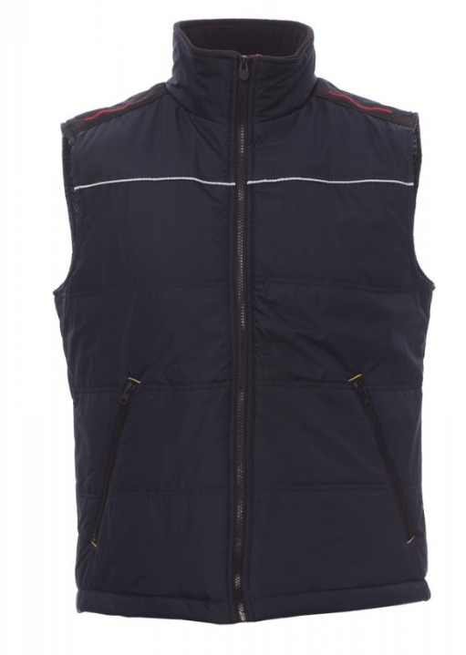 Gilet unisexe à zip de 5 mm en plastique avec curseur en métal, arrière profilé, deux grandes poches extérieures zippées, passepoil réfléchissant sur la poitrine et au dos. Intérieur : matelassé et doublure haute densité, intérieur de col en polaire, une poche.