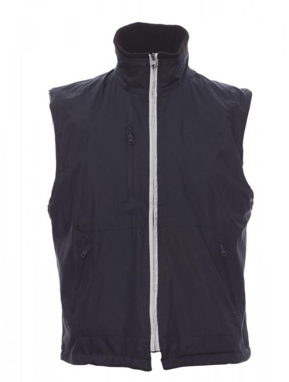 Gilet unisexe réversible à zip en plastique couvert avec profil réfléchissant, coulisse à la taille, trois poches extérieures. Intérieur : en polaire, col en bord-côte tricot, deux poches et zip sur la poitrine pour faciliter impressions et broderies.