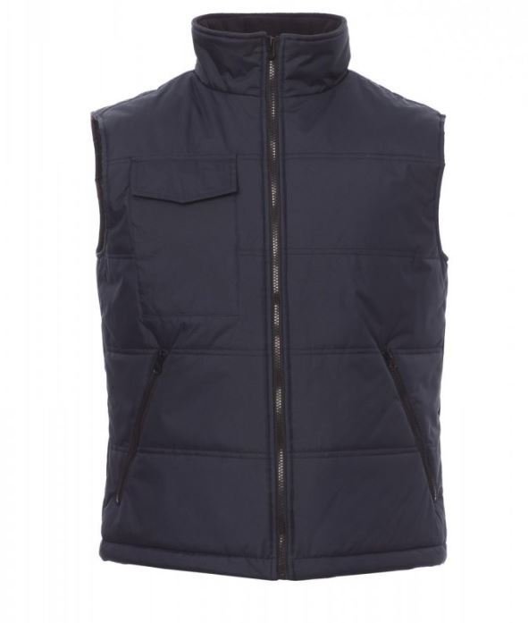 Gilet matelassé avec arrière profilé et rembourrage surpiqué, finition avec doublure haute densité, intérieur du col en polaire. Deux grandes poches zippées, poche porte-téléphone sur la poitrine et poche intérieure.