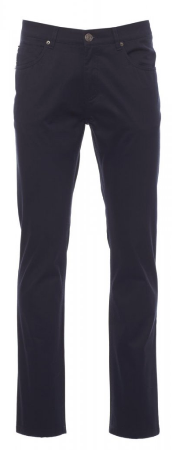 Pantalon homme, coupe jeans à cinq poches, fermeture par zip et bouton, passants à la taille et patch en cuir véritable. Coton double retors haute densité, peigné, lavage aux enzymes.
