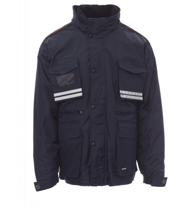 Parka quatre usages comprenant : veste extérieure non matelassée, doublée en nylon avec col, dos et chauffe-reins en micropolaire et inserts transpirants sous les bras, zip de 8 mm en plastique avec curseur en métal couvert avec patte et boutons en plastique, capuche profilée détachable et/ou pliable dans le col, poignets réglables, bandes réfléchissantes grises devant et derrière, coudes préformés et fente latérale à soufflet et zip, neuf poches extérieures dont deux LOCK SYSTEM, deux avec zip et intérieur renforcé, une avec porte-badge réversible, coulisse à la taille et zip intérieur pour faciliter impressions et broderies. Blouson intérieur à manches détachables, matelassé, doublure haute densité et dos en micropolaire, capuche pliable dans le col, cinq poches dont une avec porte-badge réversible, fermeture au col, passepoil réfléchissant sur les épaules et double bande réfléchissante sur la poche poitrine et le dos, intérieur du col en bord côtes, une poche intérieure.