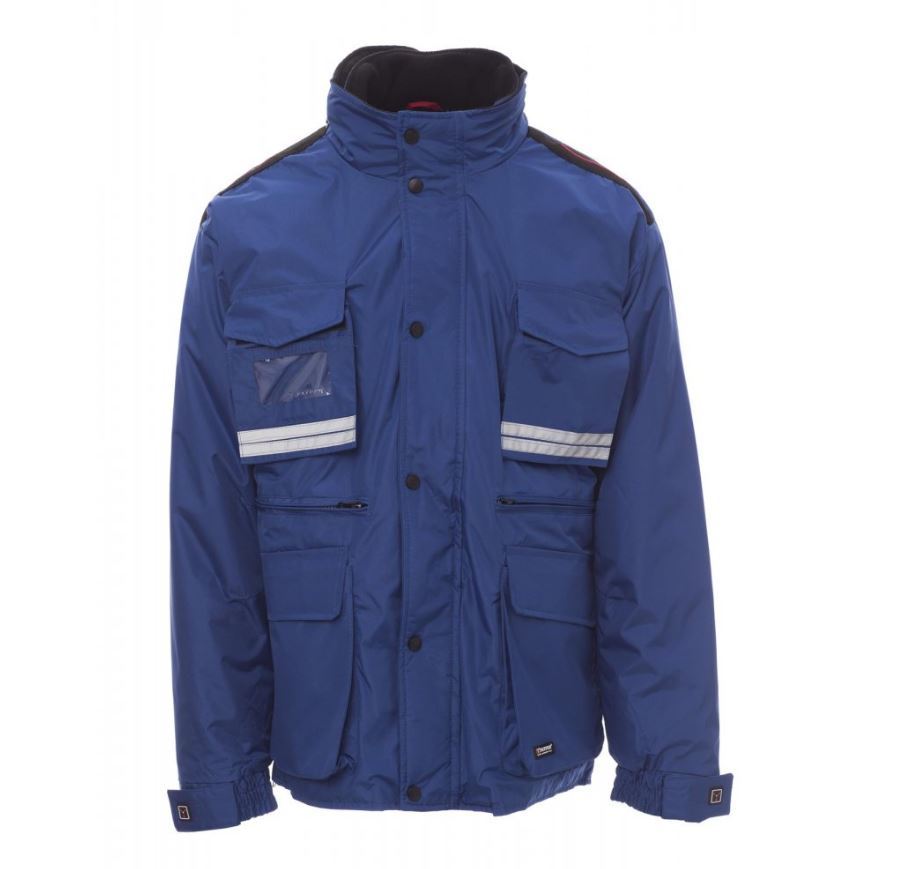 Parka quatre usages comprenant : veste extérieure non matelassée, doublée en nylon avec col, dos et chauffe-reins en micropolaire et inserts transpirants sous les bras, zip de 8 mm en plastique avec curseur en métal couvert avec patte et boutons en plastique, capuche profilée détachable et/ou pliable dans le col, poignets réglables, bandes réfléchissantes grises devant et derrière, coudes préformés et fente latérale à soufflet et zip, neuf poches extérieures dont deux LOCK SYSTEM, deux avec zip et intérieur renforcé, une avec porte-badge réversible, coulisse à la taille et zip intérieur pour faciliter impressions et broderies. Blouson intérieur à manches détachables, matelassé, doublure haute densité et dos en micropolaire, capuche pliable dans le col, cinq poches dont une avec porte-badge réversible, fermeture au col, passepoil réfléchissant sur les épaules et double bande réfléchissante sur la poche poitrine et le dos, intérieur du col en bord côtes, une poche intérieure.
