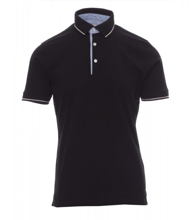 Polo pour homme à manches courtes et 3 boutons blancs, avec intérieur col, patte et fentes latérales en Oxford bleu ciel, col et bordure des manches en bord côtes avec fin profil en contraste, œillets sous les bras, fentes latérales avec couture de renfort, ruban de renfort latéral, coutures stretch, renfort profilé sur encolure arrière