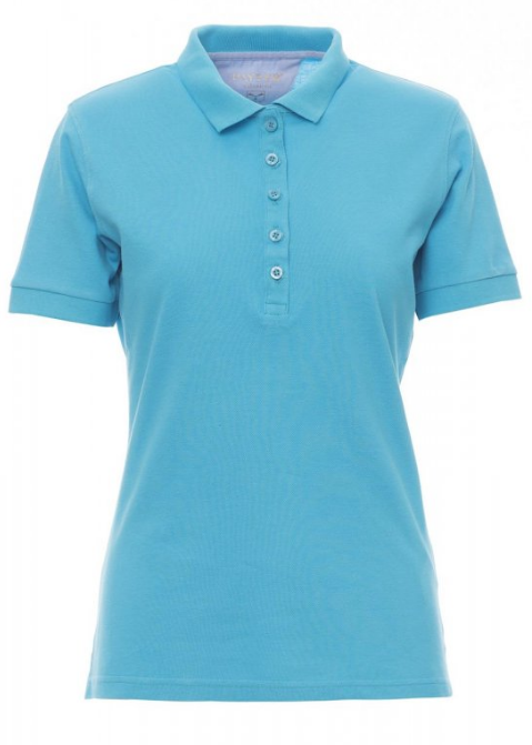 Polo cintré pour femme à manches courtes et 5 boutons assortis effet perlé, col et bordure des manches en bord côtes, fins inserts en popeline bleu ciel à l'intérieur du col, ouverture et fentes latérales, étiquette transfert, renfort profilé sur encolure arrière