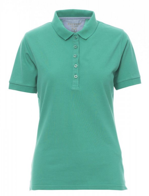 Polo cintré pour femme à manches courtes et 5 boutons assortis effet perlé, col et bordure des manches en bord côtes, fins inserts en popeline bleu ciel à l'intérieur du col, ouverture et fentes latérales, étiquette transfert, renfort profilé sur encolure arrière