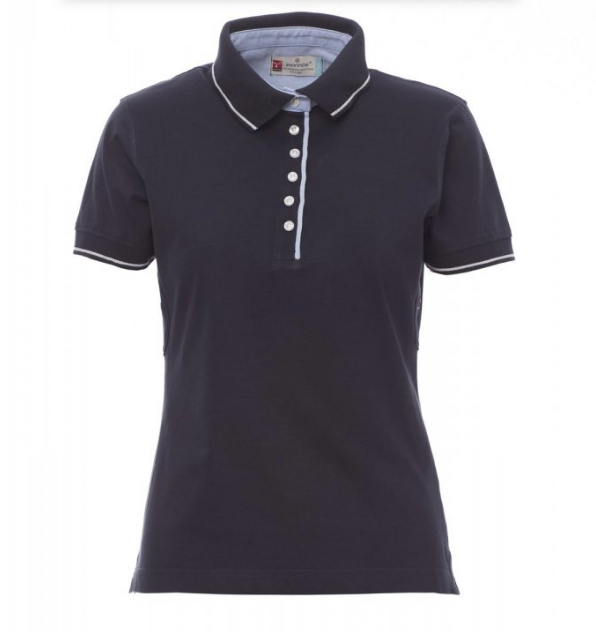 Polo cintré pour femme à manches courtes et 6 boutons blancs, avec intérieur col, patte et fentes latérales en Oxford bleu ciel, col et bordure des manches en bord côtes avec fin profil en contraste, œillets sous les bras, fentes latérales avec couture de renfort, ruban de renfort latéral, coutures stretch, renfort profilé sur encolure arrière