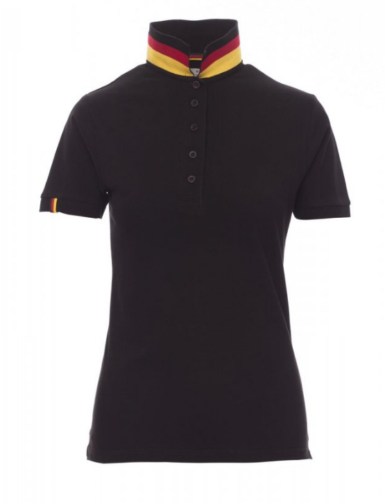 Polo femme, coupe cintrée, à manches courtes, 5 boutons teinte assortie effet nacré, col teinte assortie d'un côté et avec couleurs du drapeau contrastées de l'autre, visibles uniquement avec col remonté ; bas de manche droite avec insert fin couleurs drapeau en contraste, col et finition des manches en bord-côte, fentes latérales avec couleurs drapeau, coutures du col couvertes avec liseré en jersey dans couleurs drapeau, ruban de renfort latéral, ruban de renfort à l'intérieur du col.