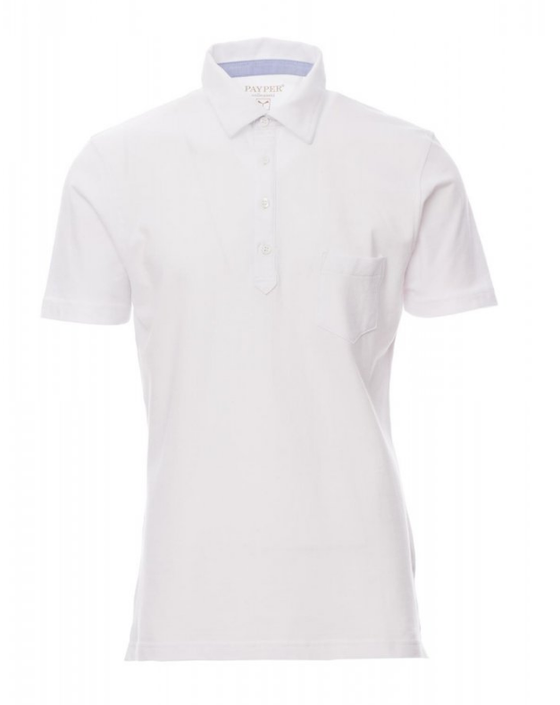 Polo pour homme à manches courtes et 4 boutons assortis effet perlé, col en piquet façon chemise et petite poche, fins inserts en popeline bleu ciel à l'intérieur du col, ouverture et fentes latérales, étiquette transfert, renfort profilé sur encolure arrière