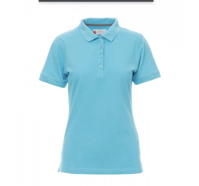 Polo cintré pour femme à manches courtes et 4 boutons assortis effet perlé, col et bordure des manches en bord côtes, fentes latérales, coutures du col couvertes avec ruban en contraste, coutures stretch, ruban de renfort latéral, renfort profilé sur encolure arrière