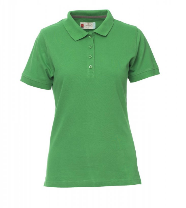 Polo cintré pour femme à manches courtes et 4 boutons assortis effet perlé, col et bordure des manches en bord côtes, fentes latérales, coutures du col couvertes avec ruban en contraste, coutures stretch, ruban de renfort latéral, renfort profilé sur encolure arrière
