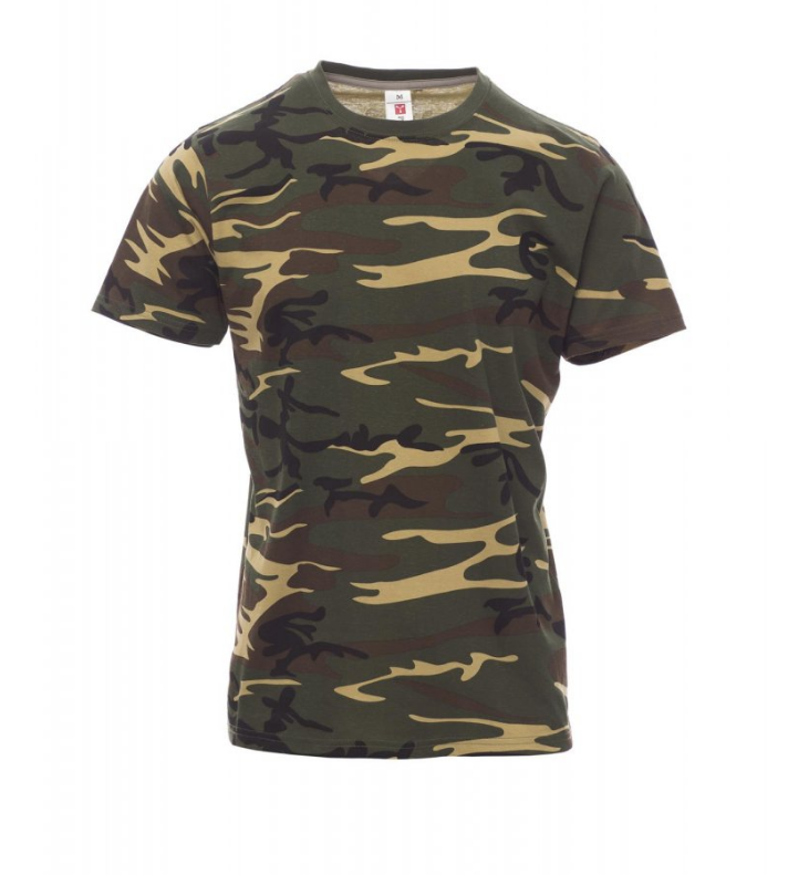 Tee-shirt pour homme, encolure ras le cou et manches courtes, col en bord côtes mixte spandex de 1,5 cm avec couture rabattue sur le devant, ruban de renfort d'épaule à épaule dans couleur en contraste sur le col, coutures stretch, structure tubulaire (couleur mimétique avec couture latérale)